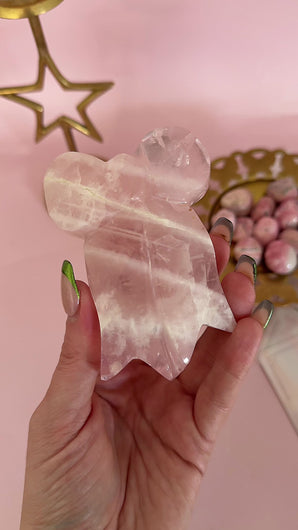 Invite softness, grace and divine love into your space with this exquisite hand carved Rose Quartz bow. Shaped as a symbol of sacred union and gentle strength, the bow represents the tying together of heart and soul, earthly emotion and celestial wisdom